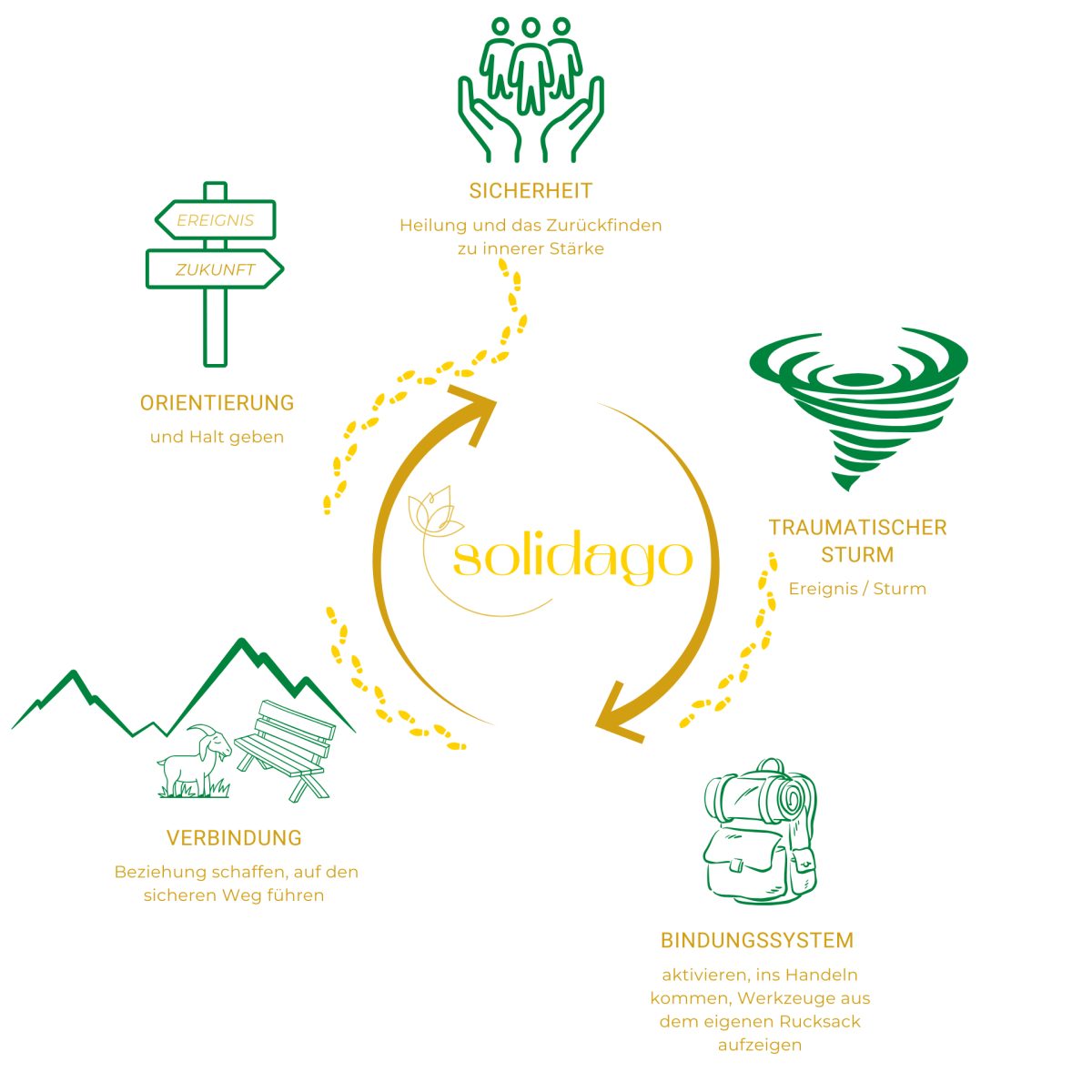 Der Verein Solidago begleitet Kinder, Jugendliche und Erwachsene in den Kantonen Appenzell Ausserrhoden & Innerrhoden nach ausserordentlichen Ereignissen. Wir schliessen eine Versorgungslücke, sodass Betroffene nach dem Ereignis über längere Zeit niederschwellig Begleitung erhalten. Damit können posttraumatische Belastungsstörungen verhindert werden. Dies gelingt, indem sie Orientierung erhalten, ihre Selbstfürsorge gefördert wird und das Puzzle des Ereignisses vollständig wird. Die Bezugspersonen werden sensibilisiert und somit gewinnen die Betroffenen ihre Autonomie zurück. Die ersten fünf Beratungen sind kostenlos.